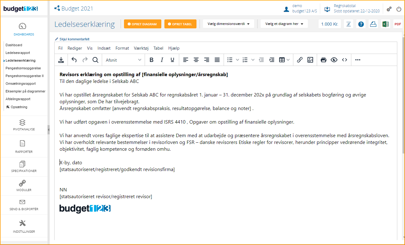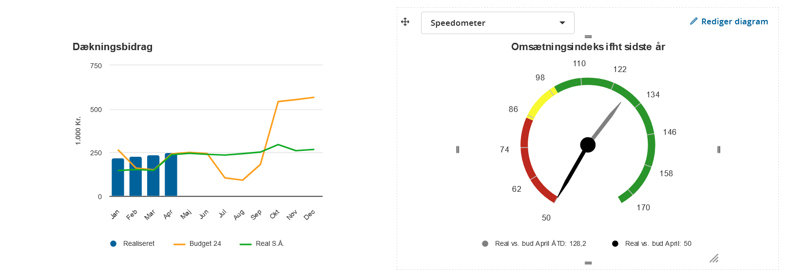 budget123 vil på baggrund af konfigurationen oprette to rapporter under Dashboards, dels selve Dashboardet med prædefinerede diagrammer, som du selv kan redigere, dels en Ledelsesrapport med dine vigtigste nøgletal. Ledelsesrapporten er autogenereret ved konfigurationen af systemet, men du kan frit redigere.
