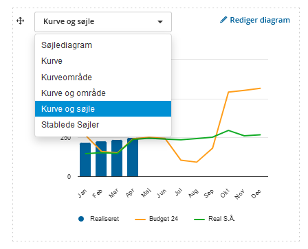 Åbn drop down-menuen for at ændre diagrammets udseende, f.eks fra kurver til søjler, eller klik på linket [Rediger diagram] for at lave helt om i diagrammets opsætning, f.eks ændre farver, skifte dataserie eller visning.
