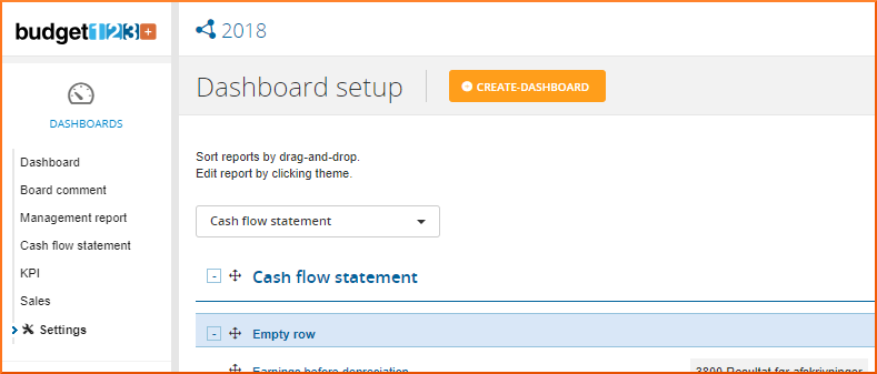 Som du kender det fra dashboards i dattervirksomhederne, kan også på koncernniveau lave specielle rapporter, hvor du selv definerer indholdet til tabellen på dashboardene. Du læser mere om hvordan dashboardlinjerne laves her dashboard-linjer. Du kan fx bygge en pengestrømsopgørelse for koncernen, en komprimeret bestyrelsesrapport med de absolutte hovedtal for koncerne, eller en rapport der sammenholder KPI’er fra dattervirksomhederne.
