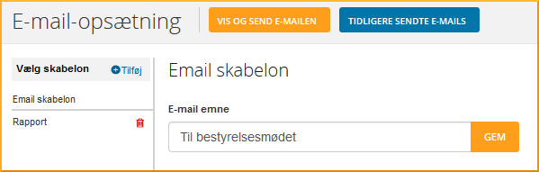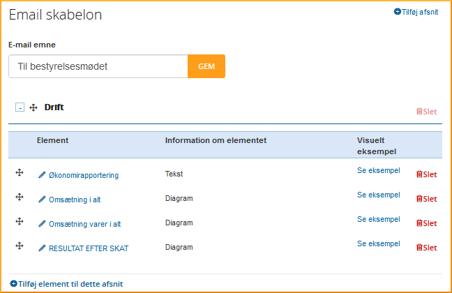 Hvis du trykker på E-mail-opsætning kommer du til en side, hvor du har mulighed for at lave en E-mail skabelon. Giv skabelonen et navn, opret sektioner/afsnit, og vælg så hvilke elementer, dvs. grafer, tabeller eller kommentarer, du vil have med i mailen. Du vil altid have muligheden for at tilføje flere skabeloner eller at rette i dine skabeloner.