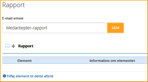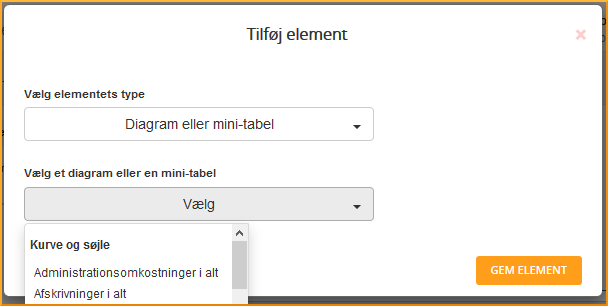 For at indsætte et passende diagram eller tekst, trykker du på [+Tilføj element til dette afsnit] i bunden i venstre side. Du får nu muligheden for at vælge, om du vil indsætte en tekst, et diagram eller mini-tabel. Vælger du diagram eller mini-tabel, kommer der en drop-down menu med de typer af diagrammer du kan vælge, som du har lavet under dashboard. Når du har valgt det du skal bruge, trykker du på gem element.