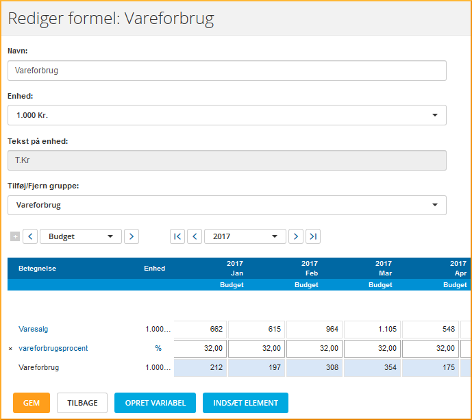 budget123 skal altså beregne: [Vareforbrug] = [Omsætning i alt] * [vareforbrugsprocent] Vareforburg = (Sum)Konto * x % Med budget123s terminologi svarer det til: Formel = Element * Variabel |