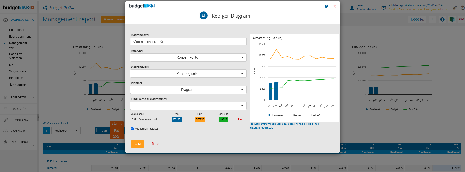 Når du vil oprette eller redigere et diagram har du forskellige typer data, du skal fastsætte. Du kan løbende se, hvilken betydning dine beslutninger har for diagrammet direkte i redigeringsvinduet. Ved at vise forskellige grafer, opnår du en større og bedre forståelse af koncernen.