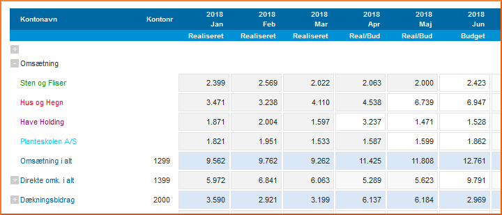 Hvis kontogruppen ikke er foldet ud, så man kan se de enkelte virksomheders bidrag til gruppen, og der er en blanding af budget og realiserede tal for måneden, anvendes en svagere baggrundsfarve, se fx april og maj på Direkte omk. i alt i billedet herover..