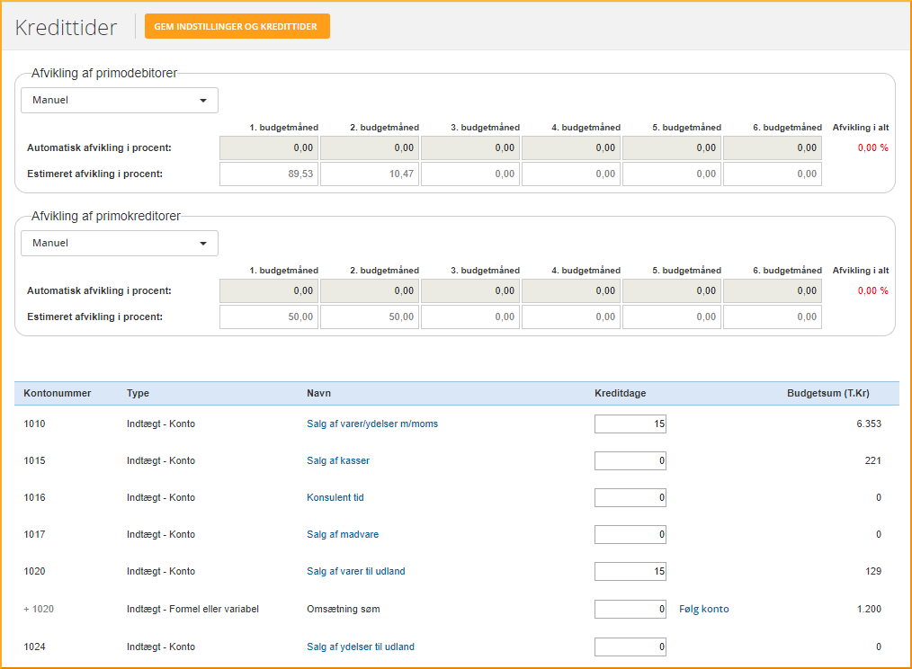 På siden med Kredittider, finder du først afvikling af primodebitorer og Afvikling af primokreditorer. Her kan du indstille om dette skal ske manuelt eller automatisk, og hvis automatisk, angive procenter for afviklingen. Rækken med “Estimeret afvikling i procent” er systemets forslag, baseret på de kreditdage som er angivet på konti og kontospecifikationer (Vægtet i forhold til hvor meget der budgetteres på de enkelte linjer).