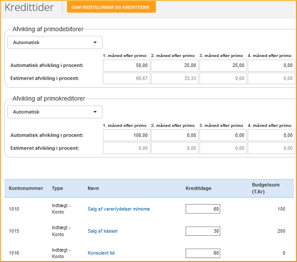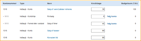 Du finder Kredittiderne i menuen til venstre under Indstillinger. Her finder du alle konti fra din kontoplan, samt de kontospecifikationslinjer og formellinjer du måtte have oprettet. Du kan ud for hver enkelt se og redigere kreditdagene. Angiv med minus (fx -30) hvis der er tale om en forudbetaling.