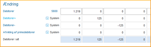 Når du har angivet en kredittid, “parkerer” budget123 automatisk det beløb du har til gode eller du skylder på samlekontoen for enten Debitorer eller Kreditorer, alt efter om kontoen er en indtægts- eller en udgiftskonto. Du kan herunder se, hvordan en omsætning på 100 i Januar, med moms og 30 kreditdage, bliver til en opskrivning af Debitorbeholdningen med 125 i januar og en nedskrivning med 125 i februar, hvor der går 125 ind som indbetaling på Likviditetsbudgettet. De 25 er automatisk registreret i forhold til moms og vil blive afregnet i henhold til dine momsindstillinger.