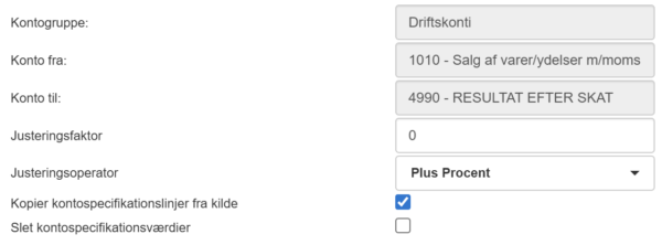 Funktionen har effekt på det niveau, du står på i øjeblikket (f.eks. Drift, Specifikation, Konto eller Forudsætningsbalance). I dialogboksen kan du altid se præcis hvilken kontogruppe samt hvilke kontonumre (fra/til), der bliver påvirket.