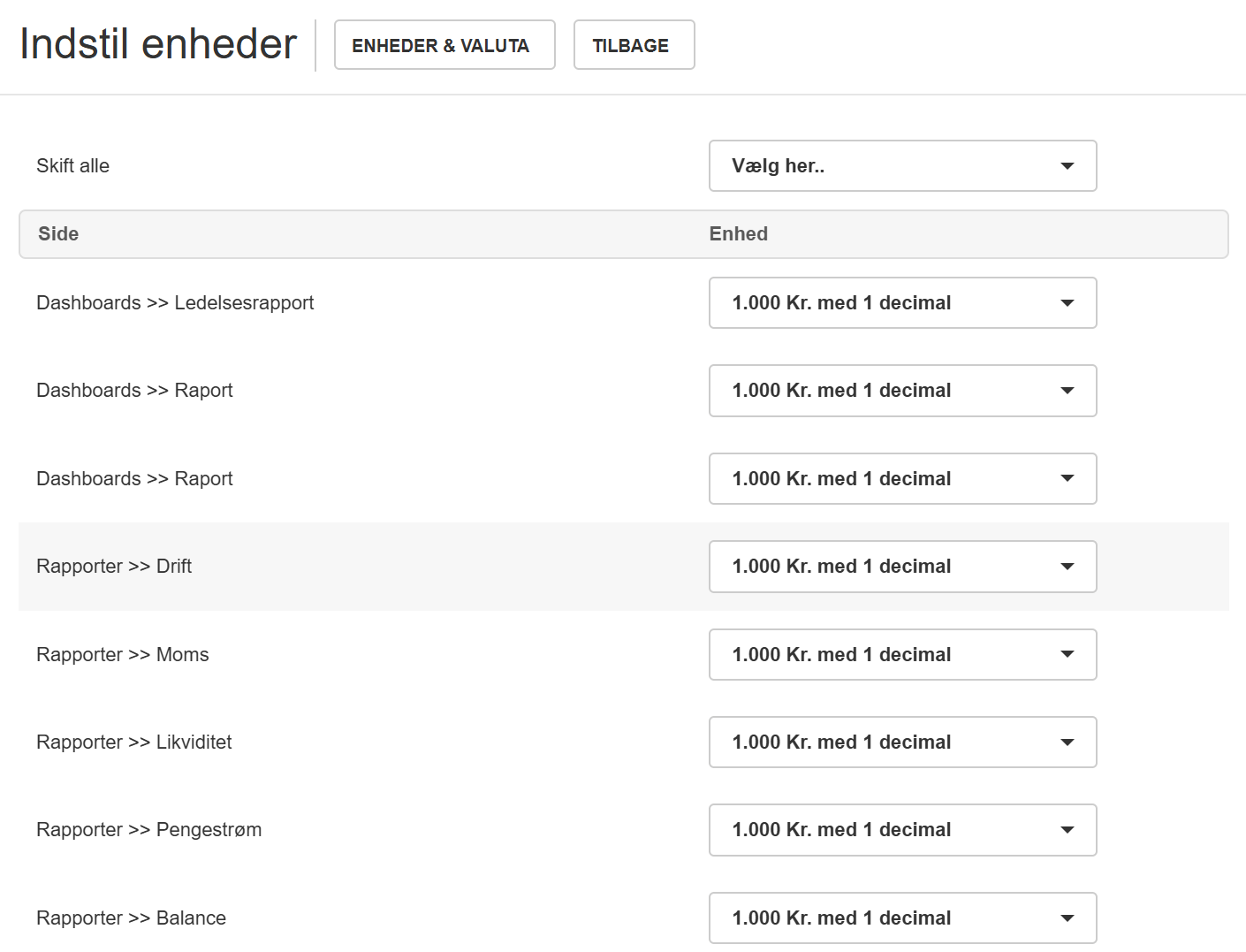 I værktøjslinjen øverst til højre finder du enheder (det er vist som den enhed du har f.eks. Kr. eller 1.000 Kr.), hvor du kan tilpasse præsentationen af dine tal. Funktionen ændrer kun på visningen, dine underliggende data forbliver uændrede.