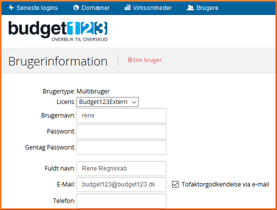 Administrerer du flere licenser i budget123, så finder du administrationsbjælken øverst i billedet. Der kan du klikke på Brugere, og så gå ind på den enkelte bruger for at aktivere tofaktorlogin. Du kan også logge direkte ind i en licens og gøre som beskrevet i [1].