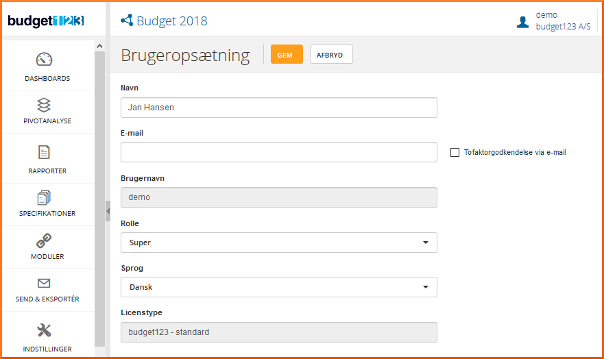 Som et ekstra sikkerhedslag, kan du aktivere tofaktorgodkendelse for alle brugere af budget123, report123 eller budget123+